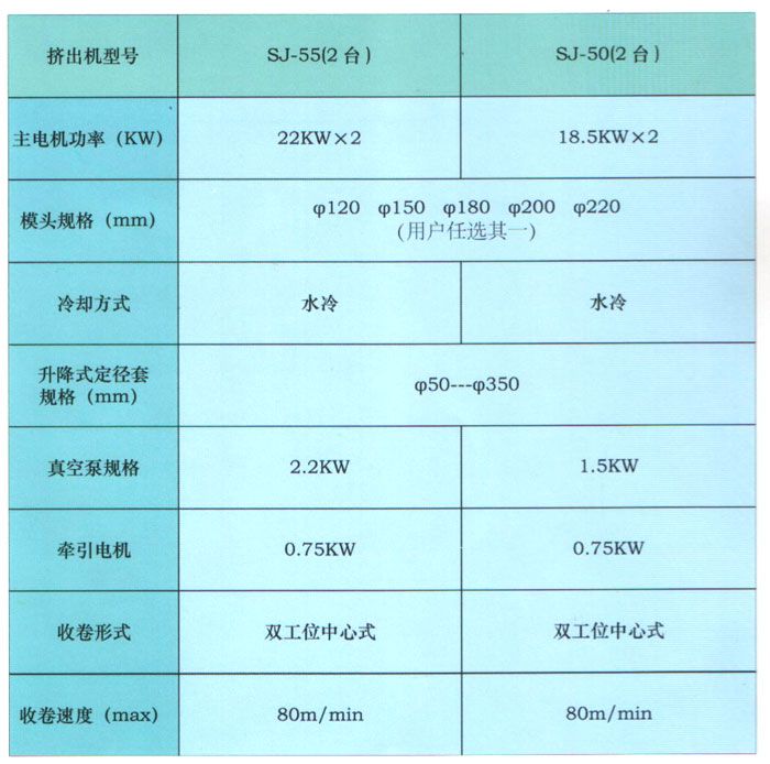 该机组主要用于生产PPPE等双层输水带。设备采用了新型双层下吹结构,新型迷宫式冷却定型装置,所生产的制品厚簿均匀,耐压能力强,更换相应模具可生产直径50mm-350mm范围内的多种规格水带。
